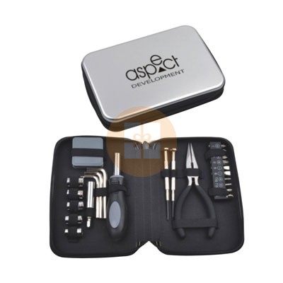 高檔銀色金屬外殼,內含1個鉗子、10個螺絲頭、2個鐘表螺絲頭、5個套筒、3個內六角、1個接桿、1把卷尺和1個手柄