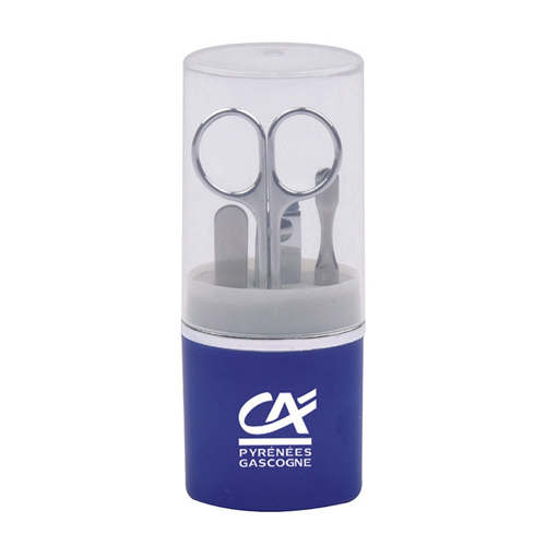 產品描述: 透明上蓋,鍍鉻中圈,彩色底座,含指甲刀、彎頭多用剪、指甲銼、挖耳勺,款式新穎,方便攜帶。