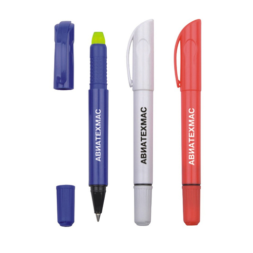 貨號:1629 產品顏色: 白、藍、紅 廣告位材料:PP 最大廣告尺寸:4x0.8cm 產品尺寸:14.6x2cm 毛/凈重: 9/7.5公斤 外箱尺寸:49x16.5x33cm 包裝方式:1支/膠袋,50支/中盒,500支/外箱 產品描述:彩色大身,配同色筆帽,雙頭設計,頭部為圓珠筆,尾部為黃色固態熒光筆